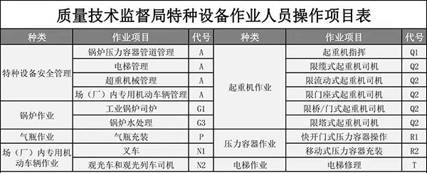 質(zhì)監(jiān)局:報(bào)考工種:特種安全設(shè)備管理A,起重機(jī)指揮Q1,起重司機(jī)(限門座式起重機(jī))Q2,起重司機(jī)(限橋式起重機(jī))Q2,起重司機(jī)(限門式起重機(jī))Q2,起重司機(jī)(限纜索式起重機(jī))Q2,起重司機(jī)(限塔式起重機(jī))Q2,起重司機(jī)(限流動(dòng)式起重機(jī))Q2,起重司機(jī)(限升降機(jī))Q2,叉車司機(jī)N1,觀光和觀光列出司機(jī)N2,電梯維修T,鍋爐壓力容器壓力管道管理,電梯管理,起重機(jī)械管理,場(chǎng)(廠)內(nèi)專用機(jī)動(dòng)車輛管理,工業(yè)鍋爐司爐,電站鍋爐司爐,鍋爐水處理,快開門式壓力容器操作,移動(dòng)式壓力容器充裝,氣瓶充裝,金屬焊接操作(壓力焊PE焊),非金屬焊接操作(壓力容器焊),食品檢驗(yàn)員,化學(xué)檢驗(yàn)員,農(nóng)產(chǎn)品檢驗(yàn)員!
