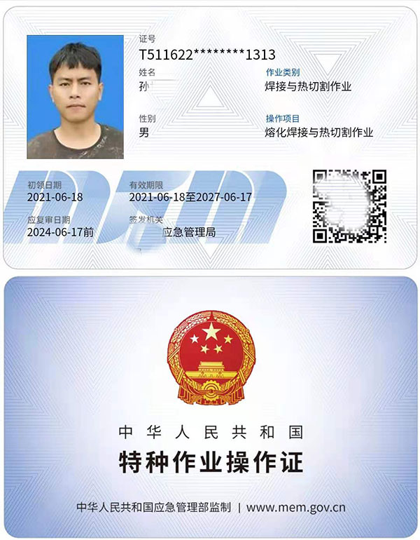 焊工操作證證書(shū)展示