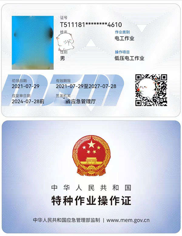 2,低壓電工證”,又稱“ IC 卡”、"上崗證”、”操作證”等。它由“安全生產監督